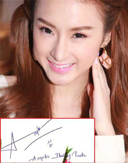 Nữ diễn viên Angela Phương Trinh sở hữu chữ kí mang hơi hướng nghệ sĩ và khá giống với nghệ danh. Chữ A được cô thể hiện như một ngôi sao năm cánh.