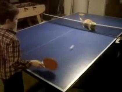(VTC News) - Chú mèo bên kia lưới cố đẩy quả bóng bàn mà cậu bé đánh sang.