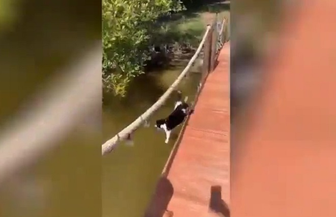 Lanh chanh vượt mặt chủ trên chiếc cầu hẹp, chú mèo rơi tõm xuống nước ướt sũng người, lại còn giận dỗi gào ầm lên khi được cứu.