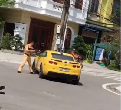 Lúc này, một chiến sĩ CSGT chạy theo, cầm súng AK phá vỡ cửa kính xe để khống chế, tuy nhiên lái xe vẫn ngoan cố tăng ga bỏ chạy.