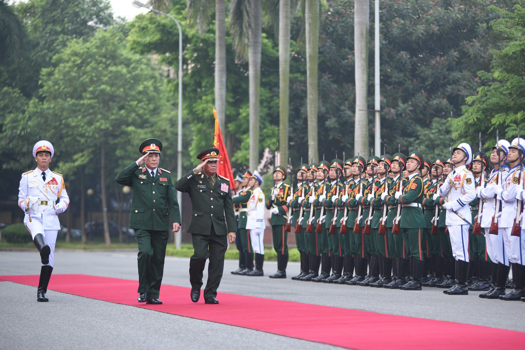 Thượng tướng Lương Cường và Trung tướng Vilay Lakhamphong duyệt đội danh dự. (Ảnh: Tùng Đinh)