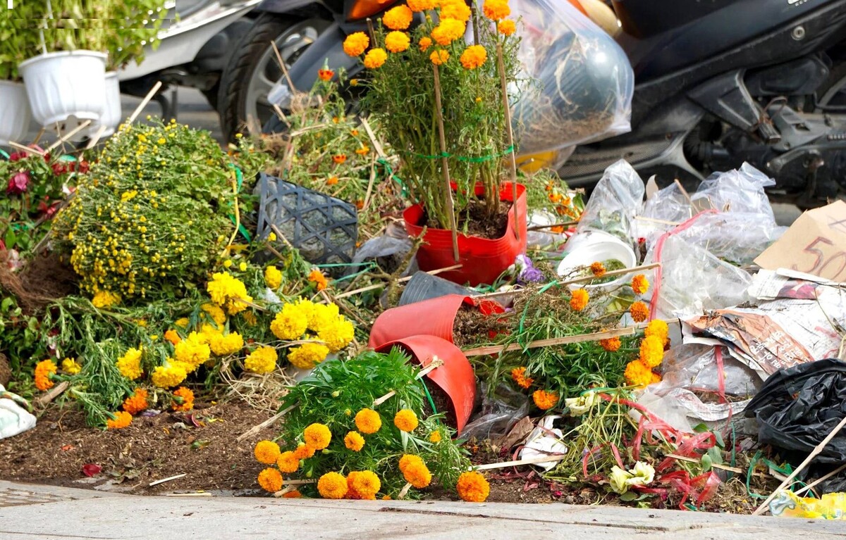 Hàng trăm chậu hoa bị bỏ nằm la liệt trên vỉa hè tại chợ hoa Thủ Thiêm (TP Thủ Đức, TP.HCM) trong chiều 30 Tết. (Ảnh: Thy Huệ)