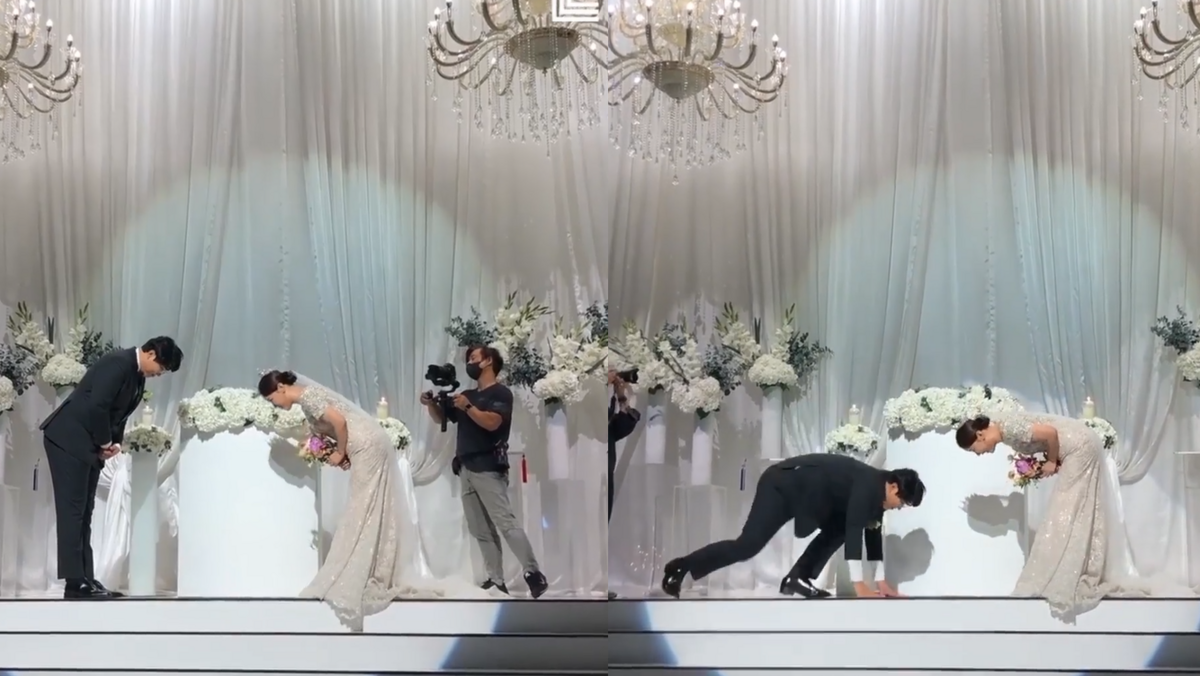 Khi chủ hôn nói "Người cúi đầu sâu hơn là người yêu nhiều hơn", chú rể liền chứng minh tình yêu của mình bằng cách nằm luôn xuống đất.