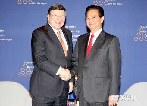 | Thủ tướng Nguyễn Tấn Dũng gặp Chủ tịch EC Jose Manuel Barroso bên lề Hội nghị cấp cao An ninh Hạt nhân lần thứ ba tại La Haye (Hà Lan), tháng 3/2014. (Ảnh: Đức Tám/TTXVN) |