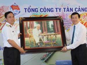 | Chủ tịch nước Trương Tấn Sang tặng quà cho cán bộ chiến sỹ của Tổng công ty Tân Cảng Sài Gòn. (Ảnh: Thanh Vũ/TTXVN) |