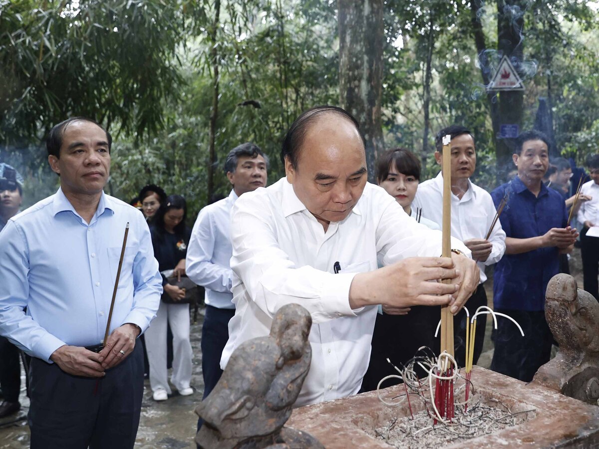 Chủ tịch nước Nguyễn Xuân Phúc cùng đoàn công tác dâng hương tưởng nhớ Bác Hồ tại Lán Nà Nưa, trong Khu di tích Quốc gia đặc biệt Tân Trào.