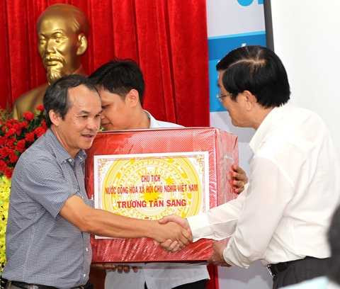 | Chủ tịch nước tặng quà lưu niệm cho đại diện ban lãnh đạo Bệnh viện Y học Hoàng Anh Gia Lai |