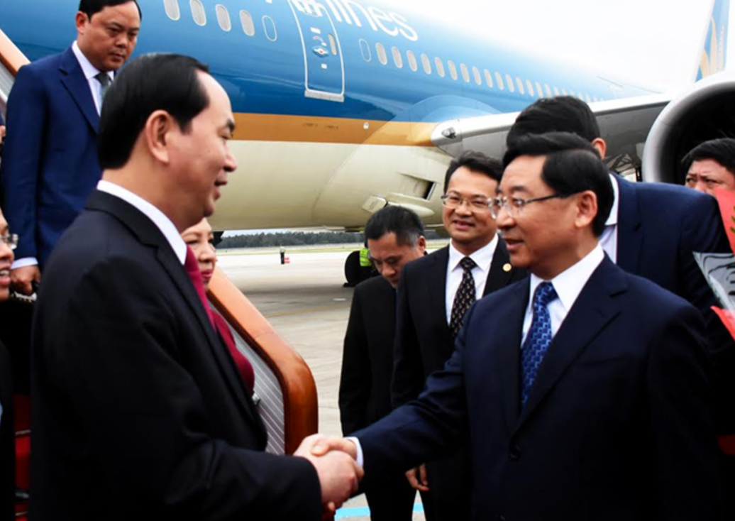 Tỉnh trưởng Tỉnh Phúc Kiến Vũ Vi Quốc đón Chủ tịch nước Trần Đại Quang tại chân cầu thang máy bay.