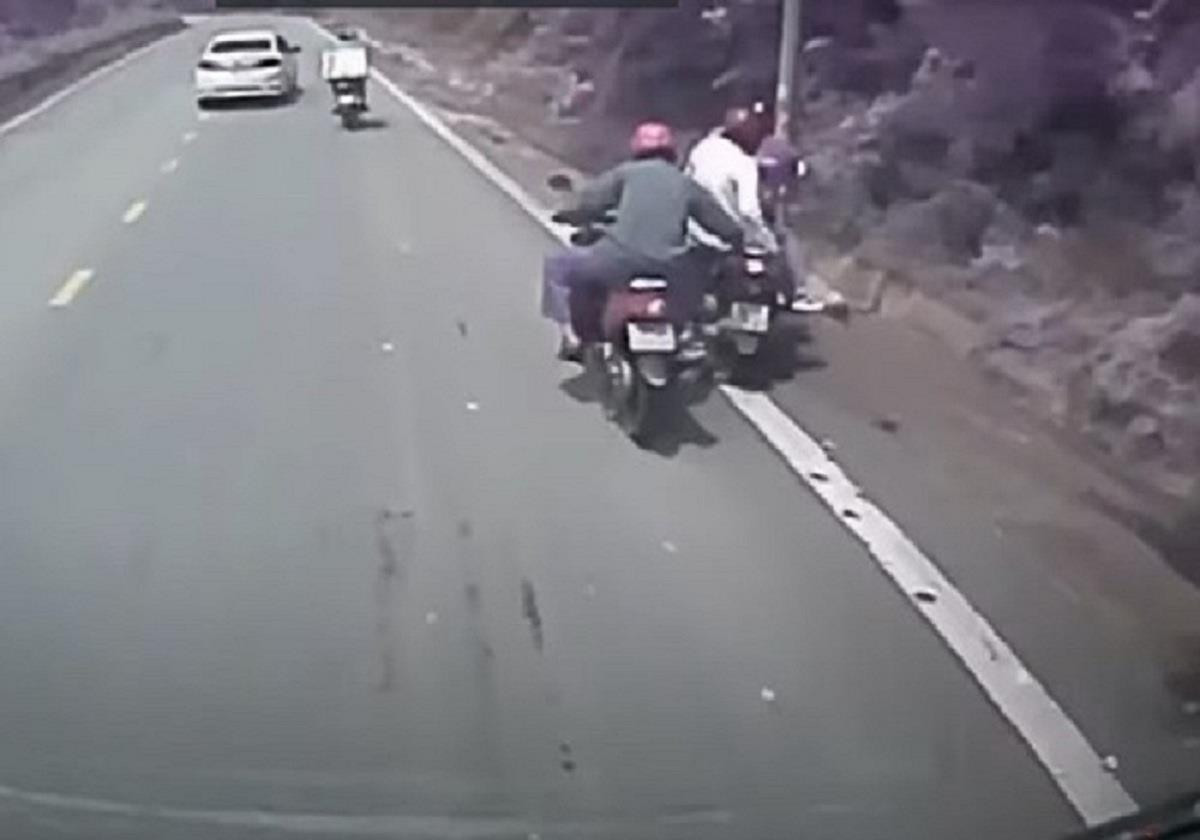 Anh Đinh Văn Chiến dũng cảm kéo xe máy bị mất phanh trên đường đèo Tam Đảo. (Ảnh cắt từ clip)