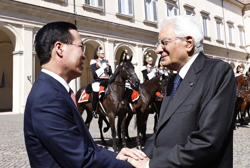 Tổng thống Italy Sergio Mattarella tiễn Chủ tịch nước Võ Văn Thưởng. (Ảnh: Thống Nhất/TTXVN)