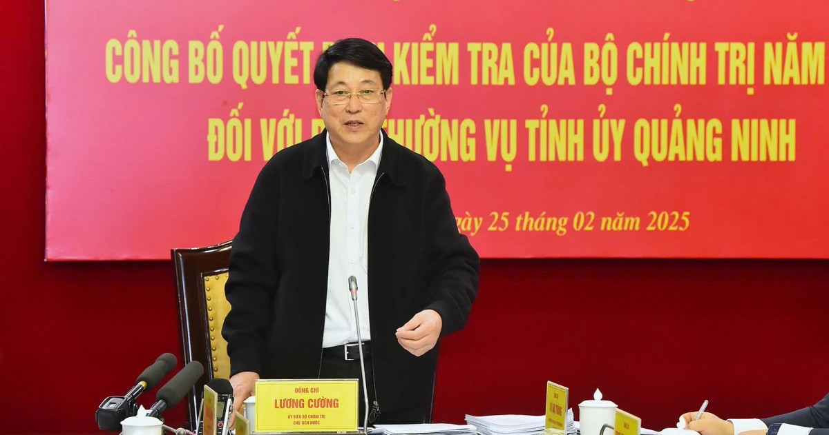 Chủ tịch nước đề nghị Ban Thường vụ Tỉnh ủy Quảng Ninh khẩn trương, tập trung hoàn thành báo cáo tự kiểm tra cùng các hồ sơ, tài liệu có liên quan, gửi Bộ Chính trị và Đoàn kiểm tra số 1907 trước ngày 28/02/2025; phối hợp chặt chẽ, kịp thời, tạo điều kiện thuận lợi cho Đoàn kiểm tra hoàn thành nhiệm vụ. Đồng thời, chỉ đạo các tổ chức đảng, đảng viên thuộc Đảng bộ chuẩn bị nội dung báo cáo theo Đề cương hướng dẫn, cung cấp đầy đủ, trung thực thông tin, số liệu; tích cực phối hợp với Đoàn kiểm tra khi thẩm tra, xác minh.