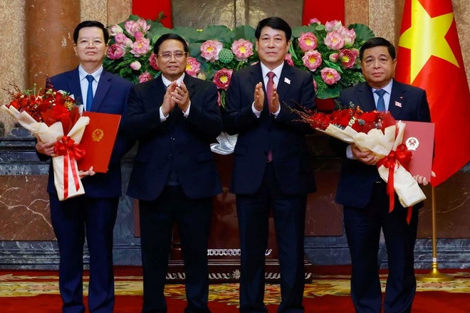 Chủ tịch nước Lương Cường trao quyết định bổ nhiệm, Thủ tướng Phạm Minh Chính tặng hoa chúc mừng Bộ trưởng Nông nghiệp và Môi trường Đỗ Đức Duy, Bộ trưởng Xây dựng Trần Hồng Minh, Bộ trưởng Khoa học và Công nghệ Nguyễn Mạnh Hùng, Bộ trưởng Dân tộc và Tôn giáo Đào Ngọc Dung. (Ảnh: Lâm Khánh/TTXVN)