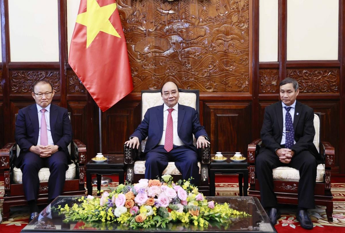 Trân trọng cảm ơn Chủ tịch nước Nguyễn Xuân Phúc dành thời gian tiếp, hai Huấn luyện viên Park Hang Seo và Mai Đức Chung cũng cảm ơn Đảng, Nhà nước Việt Nam, Bộ Văn hóa, Thể thao và Du lịch, Tổng Cục thể dục thể thao, Liên đoàn bóng đá Việt Nam và người hâm mộ Việt Nam luôn quan tâm, ủng hộ cho các đội tuyển. Khẳng định bóng đá là môn thể thao có tính khoa học cao, Huấn luyện viên Park Hang Seo mong muốn Đảng, Nhà nước tiếp tục quan tâm đầu tư cho bóng đá, nâng cao chuyên môn cho các cầu thủ cũng như quan tâm đến yếu tố tinh thần, khích lệ cầu thủ cống hiến hơn nữa cho thể thao.