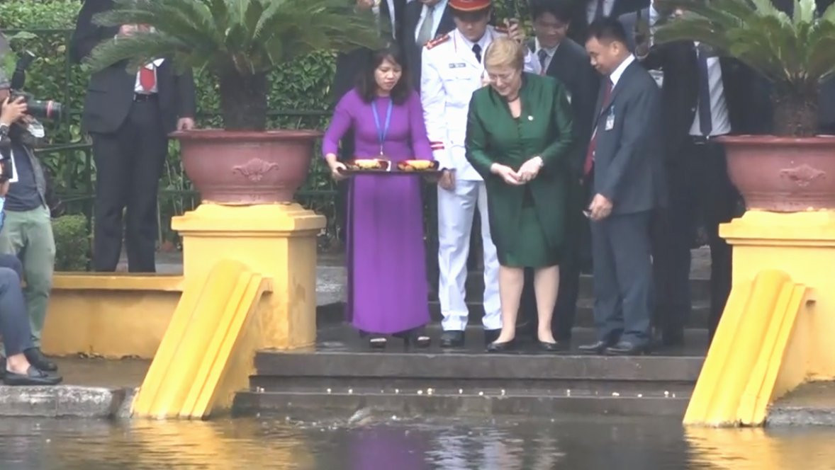 Tổng thống Chile cho cá ăn tại ao cá trong khu di tích Hồ Chủ tịch