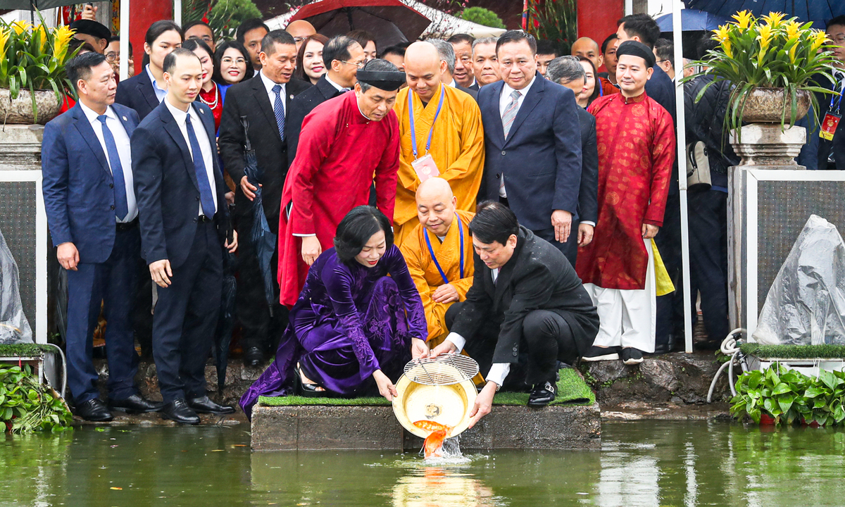 Chủ tịch nước và Phu nhân cùng các đại biểu kiều bào tham gia hoạt động thả cá chép tại hồ Hoàn Kiếm.