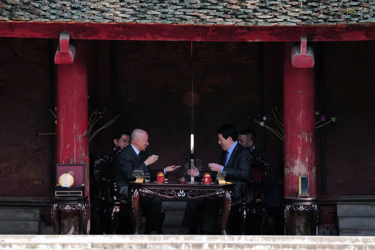 Chủ tịch nước Lương Cường và Quốc vương Norodom Sihamoni cùng thưởng trà.