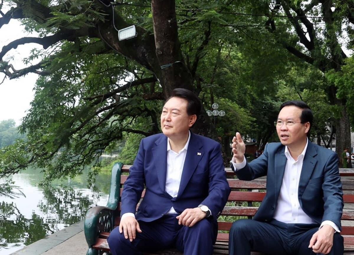 Chủ tịch nước Võ Văn Thưởng giới thiệu với Tổng thống Hàn Quốc Yoon Suk Yeol về ý nghĩa lịch sử của danh thắng hồ Hoàn Kiếm, nơi được coi là trái tim của Thủ đô Hà Nội - Thành phố vì hòa bình. (Ảnh: Lâm Khánh/TTXVN)