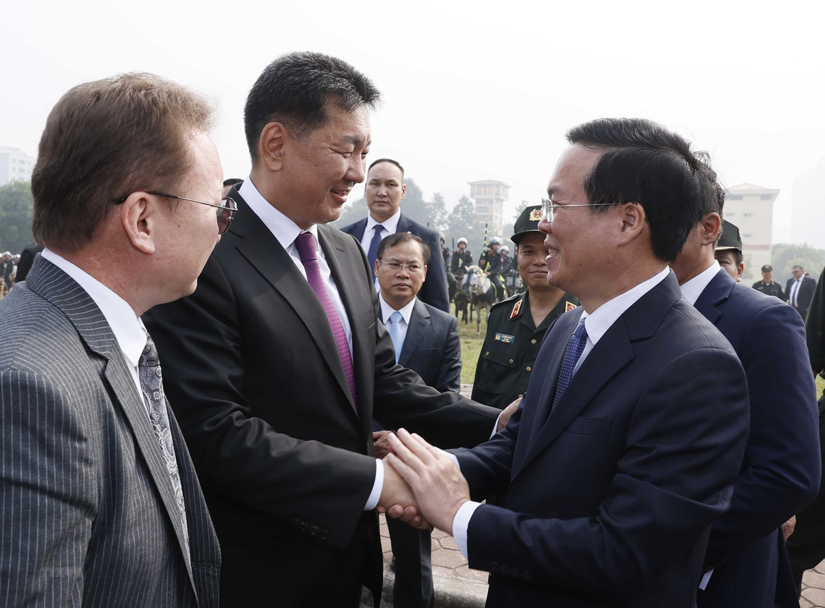 Chủ tịch nước Võ Văn Thưởng và Tổng thống Mông Cổ Ukhnaagiin Khurelsukh với các chiến sỹ Cảnh sát Cơ động Kỵ binh.(Ảnh: Thống Nhất/TTXVN)