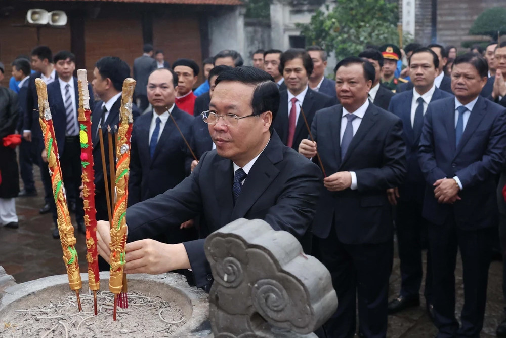 Chủ tịch nước Võ Văn Thưởng dâng hương tại Di tích Quốc gia Đặc biệt Cổ Loa. (Ảnh: TTXVN)