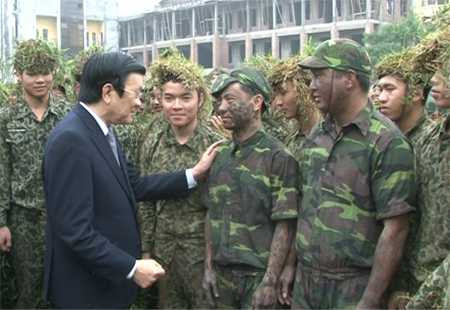 | Chủ tịch nước Trương Tấn Sang thăm hỏi, động viên các chiến sĩ đặc công tại sân tập |