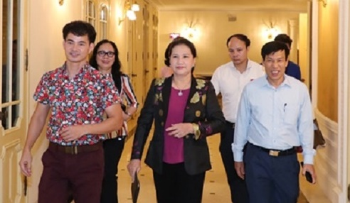 Trước giờ diễn, Chủ tịch Quốc hội Nguyễn Thị Kim Ngân và Bộ trưởng Nguyễn Ngọc Thiện đến tận phòng hóa trang để tặng quà và động viên các nghệ sĩ