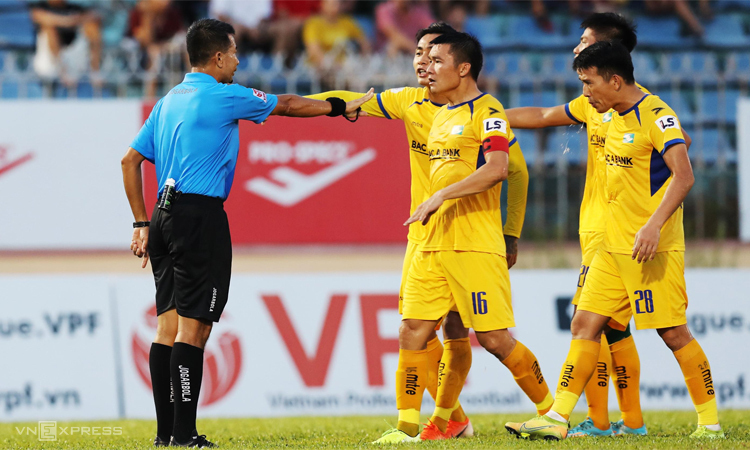Trong trận thua 1-2 trên sân của Quảng Nam, cầu thủ SLNA có hai lần quây trọng tài phản đối các quyết định. Lần đầu tiên là ở phút 58, khi Phan Văn Đức ngã trong vòng cấm sau pha băng ra vồ hụt bóng của thủ môn Phạm Văn Cường, nhưng trọng tài không cho đội bóng xứ Nghệ hưởng phạt đền. Tới phút 89, trọng tài Nguyễn Minh Thuận tiếp tục bị đội khách phản đối khi công nhận bàn thắng ấn định tỷ số 2-1 cho Quảng Nam, dù Tuấn Tài đứng ngang vạch vôi, dùng vai phá bóng ra sau quả đánh đầu của Hữu Phước.