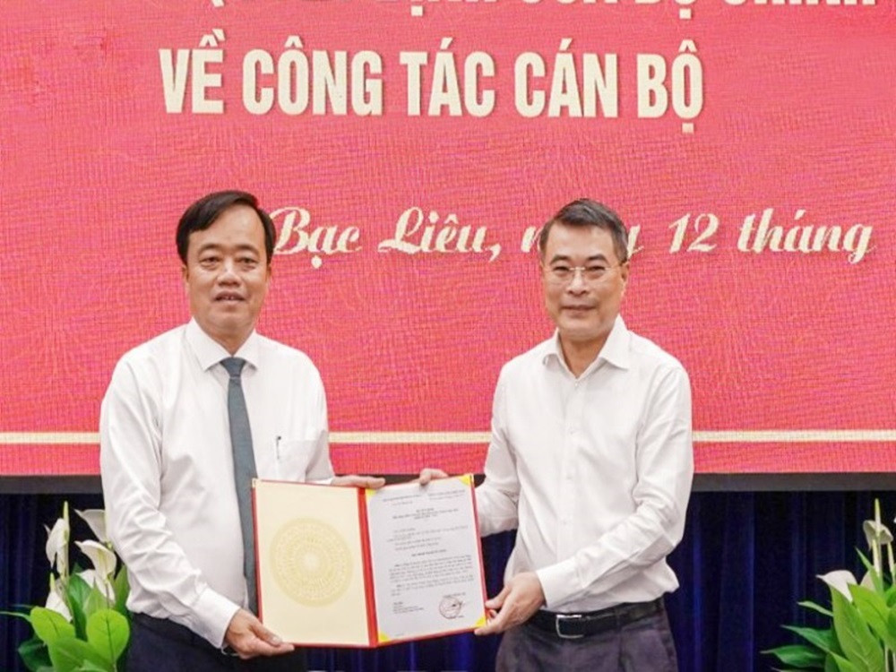 Bí thư Tỉnh ủy Bạc Liêu Lữ Văn Hùng (bìa phải) tặng hoa cho chúc mừng tân Phó Bí thư Tỉnh ủy Bạc Liêu Huỳnh Quốc Việt.