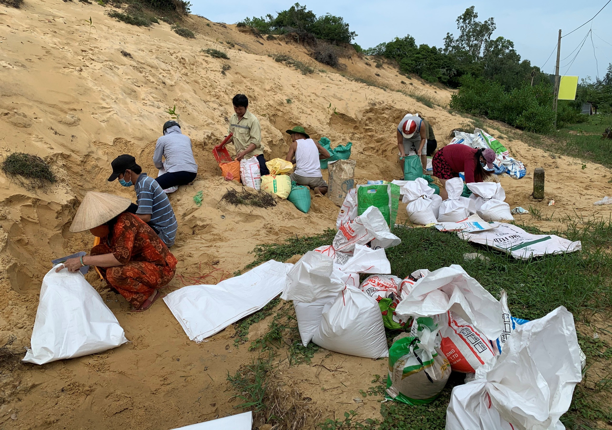 Người dân Quảng Ngãi tranh thủ xúc cát chèn mái nhà khi bão số 9 chưa đổ bộ vào đất liền.