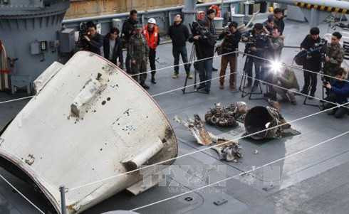 | Những mảnh vỡ nghi từ tên lửa phóng vệ tinh của Triều Tiên ngày 7/2 được phía Hàn Quốc phát hiện - Ảnh: TTXVN |