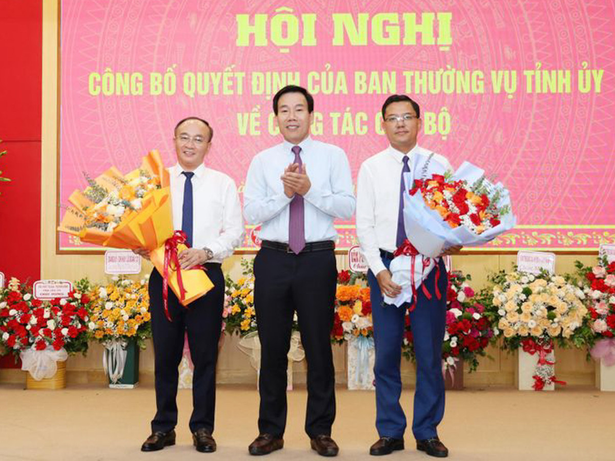 Phó Bí thư Thường trực Tỉnh ủy Vũ Xuân Cường trao Quyết định và tặng hoa chúc mừng hai đồng chí tân Phó Trưởng Ban Tuyên giáo Tỉnh ủy.