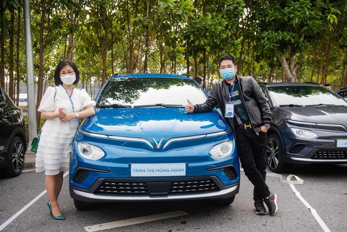 Anh Trần Đức Hùng và vợ nhận xe VF e34 tại nhà máy VinFast Hải Phòng.