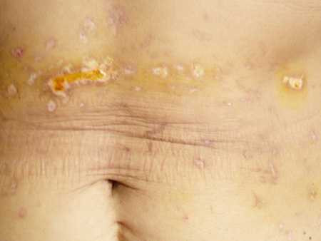 | Phần bụng của bà Thanh đầy vết sẹo bỏng do bị “thầy” Định dùng nhang đốt để trị bệnh. |