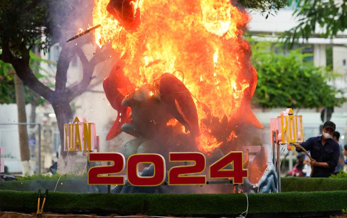 Tượng cá chép vượt vũ môn hóa rồng bốc cháy. (Ảnh: Quốc Bảo)