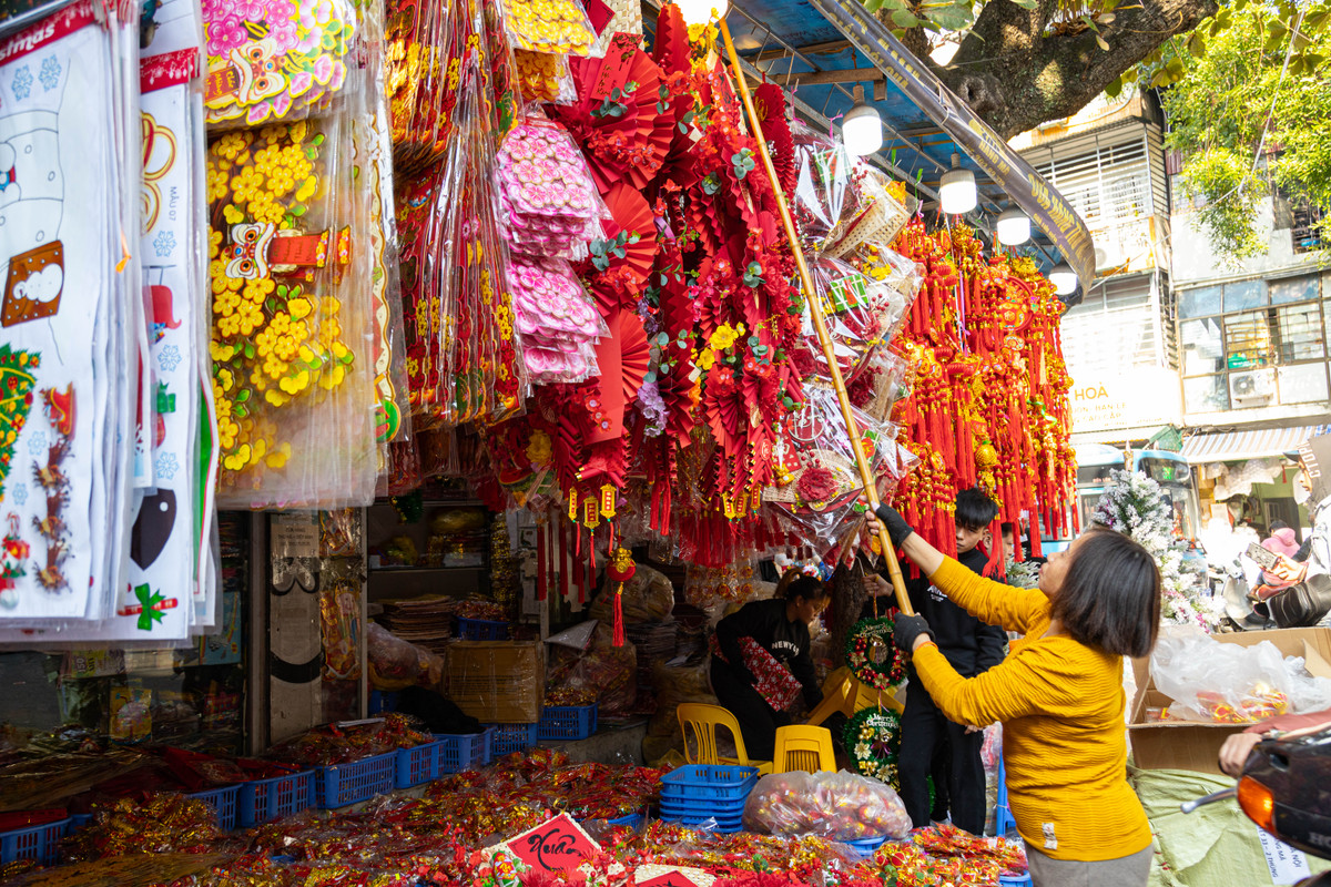 Nhiều cửa hàng "thay áo" mới để đón Tết Giáp Thìn 2024. Người kinh doanh cũng hy vọng dịp Tết Nguyên đán sẽ buôn bán thuận lợi hơn, khách mua hàng sẽ đông hơn mùa Giáng sinh.
