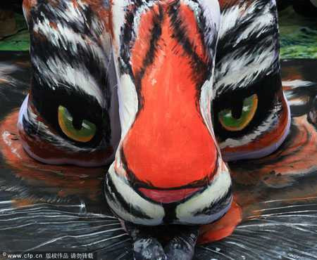 Hôm 2.1, một họa sĩ Đài Loan (Trung Quốc) trình bày sản phẩm rất đẹp của mình- hình ảnh về chúa sơn lâm, về phố phường..., sống động như thật nhưng lại được thực hiện trên lưng của ba mỹ nữ.