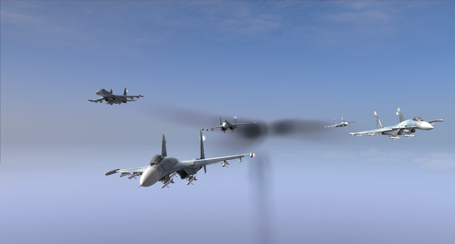 Cả 2 chiếc chiến đấu cơ Sukhoi đều đang được điều khiển bởi những phi công người Nga, họ đã phát hiện sự xuất hiện của những máy bay chiến đấu đối phương rất đúng lúc và tìm cách thoát ly, khi đột nhiên họ hứng chịu cơn mưa tên lửa tầm trung R-27 (định danh NATO AA-10 Alamo). Rất may, với những phi công Nga kinh nghiệm, chuyện này chẳng phải quá khó khăn.