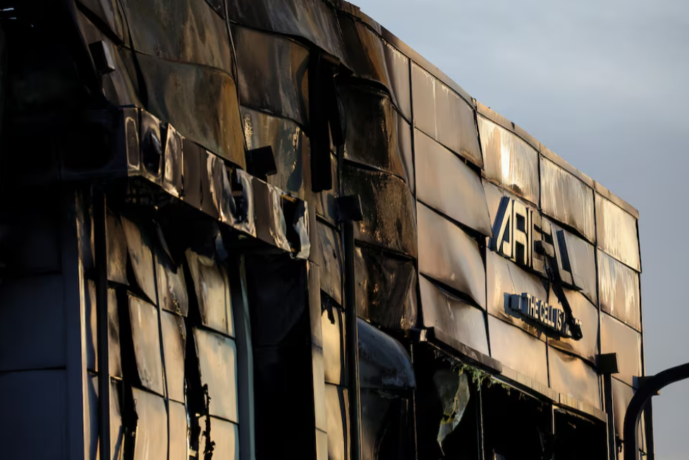 Nhà máy bị hư hỏng nặng, biến dáng sau vụ cháy. (Ảnh: Reuters)