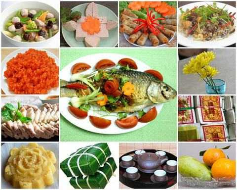 Các bà nội trợ có thể thay thịt vai luộc bằng một con gà luộc ngậm hoa hồng hoặc thay đổi các món canh như canh măng, canh mọc, canh bóng... và chuẩn bị những món hơi khác nhưng cũng vẫn giữ được truyền thống và bản sắc như: bánh chưng, xôi vò, thịt đông, nem rán, cá kho,thịt kho tàu, giò xào, hành muối, trà, rượu...
