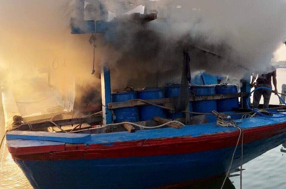 Theo đó, 6h25 ngày 25/2, tàu QNg 90917TS, công suất 804 CV của ngư dân Trần Văn Quang (1974, trú thôn Hải Ninh, xã Bình Thạnh, huyện Bình sơn, tỉnh Quảng Ngãi) chuẩn bị nhổ neo đi lấy đá lạnh ở bến Hải Ninh (xã Bình Thạnh) thì khoang máy bỗng bốc cháy dữ dội.