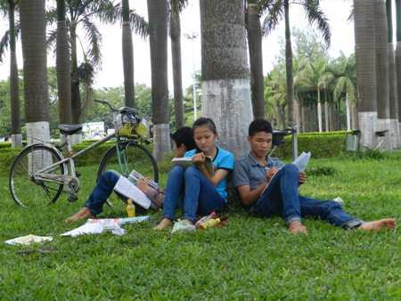 Chiều 3/7, ngay sau khi hoàn tất việc làm thủ tục đăng ký dự thi, các sĩ tử tham gia thi tại cụm thi Quy Nhơn đã tranh thủ lao ngay vào ôn luyện bài vở để chuẩn bị vượt vũ môn.