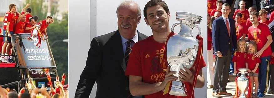 Đêm qua, từ mảnh đất chiến thắng Kiev, thầy trò Vicente del Bosque đã đáp chuyến bay về nước. Ngay từ cảng hàng không Madrid, họ được chào đón như những anh hùng dân tộc. Trước khi dự lễ diễu hành cúp vô địch theo thông lệ trên chiếc xe buýt hai tầng, toàn bộ thành viên đội tuyển được đưa tới cung điện Zarzuela làm lễ báo công trước nhà vua Juan Carlos.