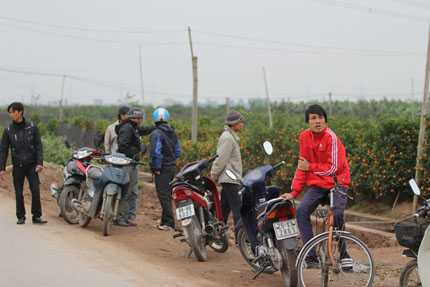 “Hiện tại, chúng tôi đã bán hết lượng quất cảnh trong vườn. Họ đã đặt tiền cả rồi, chỉ chờ ngày tới chở hàng đi mà thôi”, bà Thu, chủ một vườn quất ở đây nói. Nhiều người đã đổ xô tới Hưng Yên để buôn quất (Ảnh: Bá Thắng) Giá quất cảnh năm nay cao gấp rưỡi, gấp đôi so với năm ngoái (Ảnh: Bá Thắng)