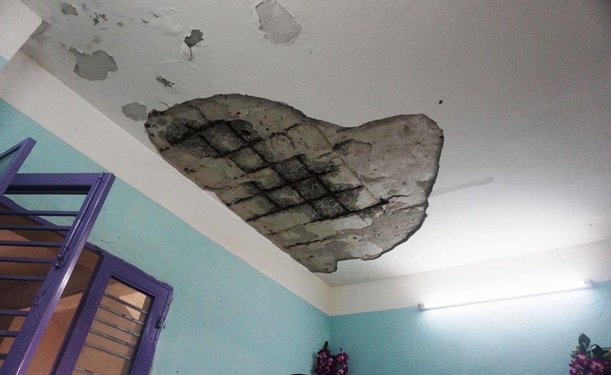 Mảng trần bung lớp vỏ, lòi khung sát rỉ rét tại Khu chung cư Vịnh Mân Quang.