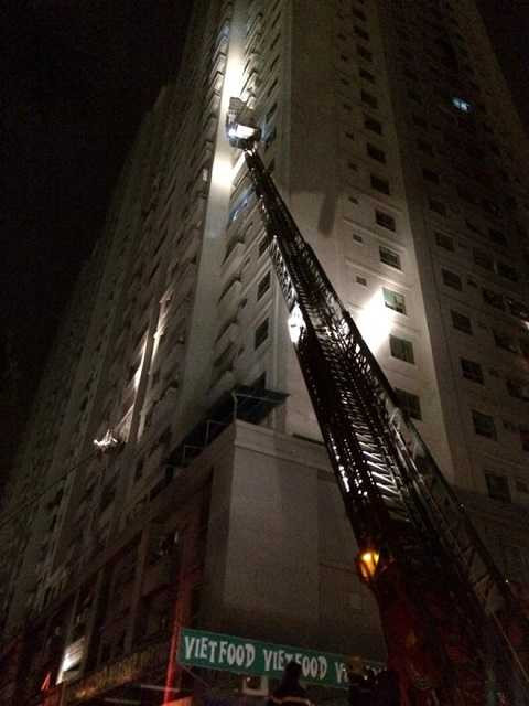 Gần 21 giờ, xe thang được điều đến hiện trường để cứu người bị mắc kẹt trên các tầng cao, sau đó nhiều người được cứu xuống trong tình trạng hoảng loạn.