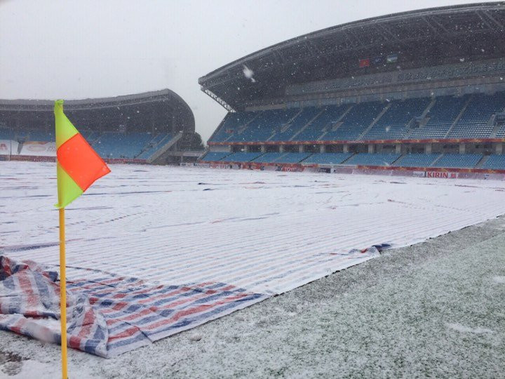 Theo báo chí Trung Quốc “ Tuyết lớn tại Thường Châu đã phủ kín mặt sân vận động cùng khu vực khán đài không có mái che. Ban quản lý sân đã nỗ lực tối đa, công tác dọn từ mặt sân đến khu vực khán đài diễn ra liên tục”. Cho đến thời điểm hiện tại, BTC vẫn chưa có thông tin chính thức hoãn trận đấu.