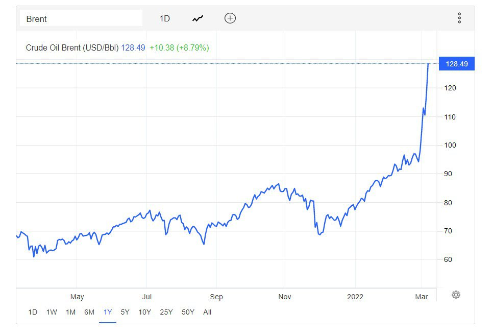 Giá dầu Brent tăng mạnh sau thông tin Mỹ xem xét cấm vận dầu thô từ Nga. Ảnh: Trading Economics.