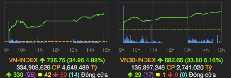 VN-Index đóng cửa tại 736,7 điểm, tăng gần 5% so với tham chiếu. Hai cổ phiếu thuộc họ Vin là VIC và VHM đóng góp lớn nhất cho VN-Index với gần 9 điểm. Thanh khoản khớp lệnh trên sàn TP HCM đạt hơn 4.600 tỷ đồng.