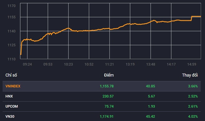 VN-Index hôm nay tăng 41 điểm (3,7%), là mức cao nhất trong lịch sử chứng khoán Việt Nam tính theo giá trị tuyệt đối. Kỷ lục cũ thuộc về phiên 2/2 khi VN-Index tăng 40 điểm (3,9%).