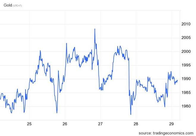 Trên sàn New York, giá mỗi ounce vàng giao ngay đã tăng nhẹ lên 1.990,6 USD. Kim loại quý đang trên đà lấy lại mốc 2.000 USD/ounce sau khi giảm mạnh trong tuần qua.