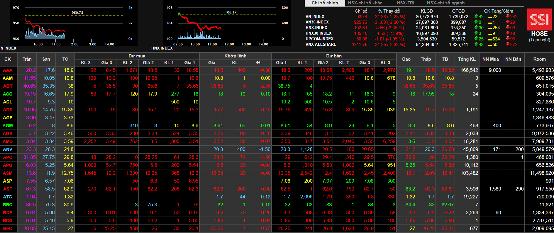 Chốt phiên giao dịch sáng nay (2/7), chỉ số VN-Index mất 21,38 điểm (2,23%) xuống còn 939,4 điểm. Khối lượng khớp lệnh đạt hơn 800 triệu cổ phiếu, giá trị khớp lệnh đạt 1.739 tỷ đồng. Số mã cổ phiếu giảm giá áp đảo so với mã tăng giá. Cụ thể, trên sàn HoSE có 242 mã giảm giá, 22 mã đứng giá và có 24 mã tăng giá.